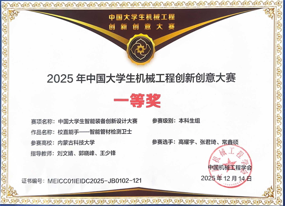 本届大赛共收到有效作品1570件,经过函评和在线答辩两轮筛选,共计428件作品进入决赛。赛事采用“海报讲解+现场答辩”的双环节评审形式,邀请全国智能装备领域高校专家学者与行业资深人士组成评审团,从创新创意、技术攻坚深度、实际应用价值、功能落地效果及社会辐射影响等多维度开展公正严谨评审。最终,我院学生团队作品《校直能手—智能管材检测卫士》斩获国家级一等奖。该团队由388vip太阳集团2023级过程装备与控制工程专业高耀宇、机械设计制造及其自动化专业张君琦等同学组成,在刘文婧、郭晓峰、王少锋老师的指导下,凭借突破性集成技术、高精度检测表现,以及自主研发的小型化、自定心、自主爬行机器人核心优势,从众多佳作中脱颖而出。