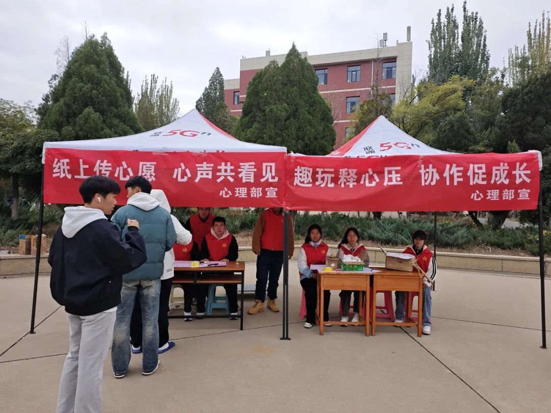 为营造积极健康的校园心理氛围,2025年10月18日,388vip太阳集团于在活动中心小广场举办了“趣玩释心压,协作促成长”和“纸上传心愿,心声共看见”心理健康教育主题系列活动。