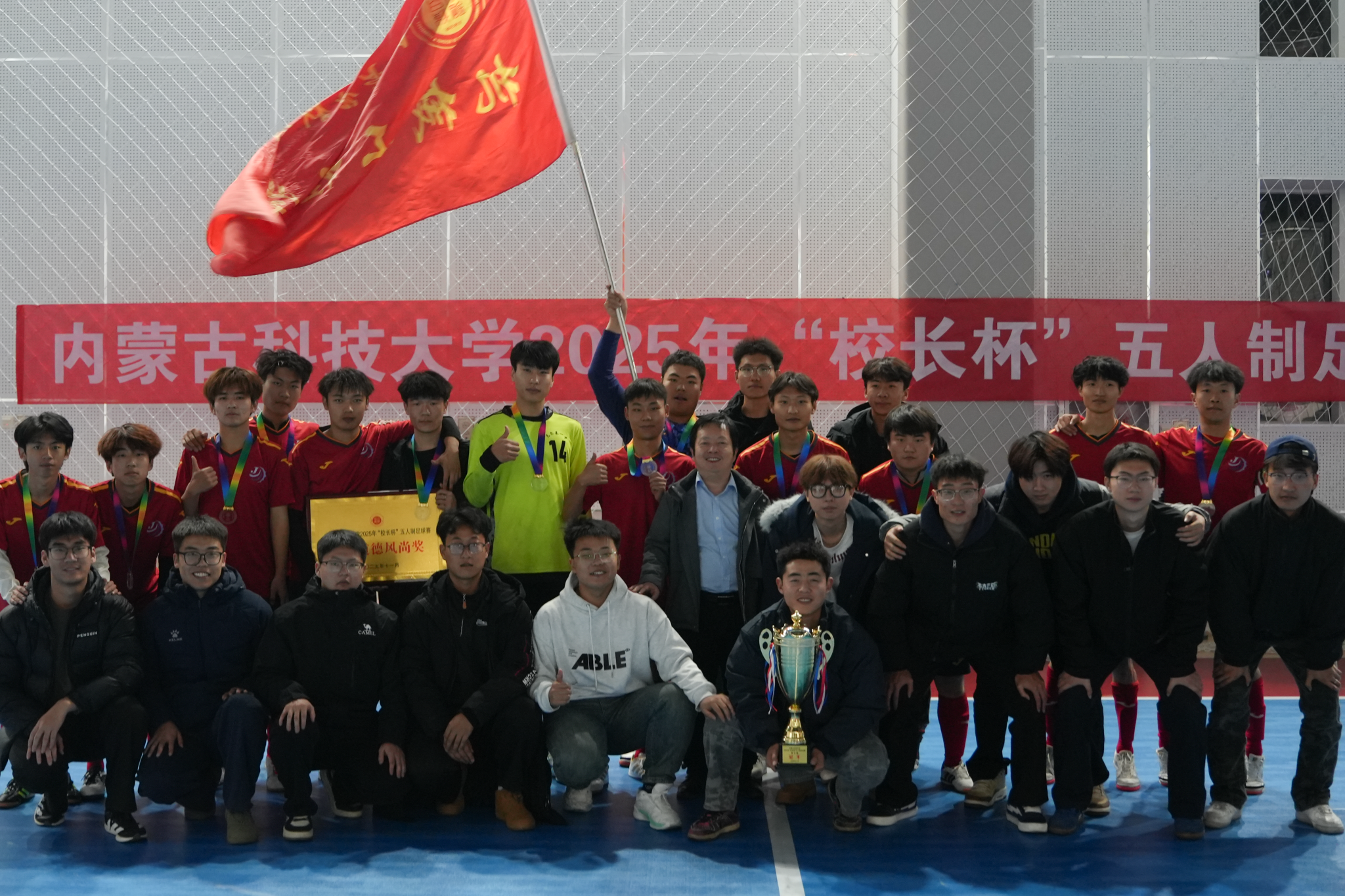 2025年11月18日晚,388vip太阳集团2025年“校长杯”五人制足球赛决赛在校体育馆举行。388vip太阳集团足球队凭借出色的团队配合与顽强拼搏精神,成功问鼎冠军!
